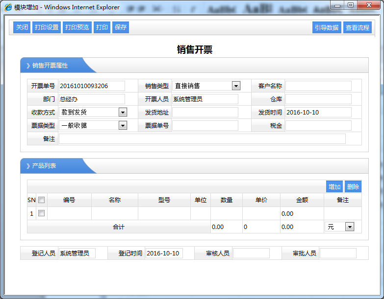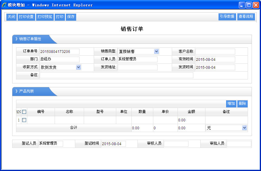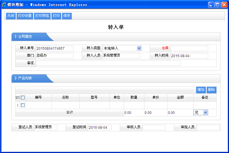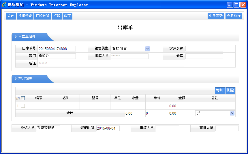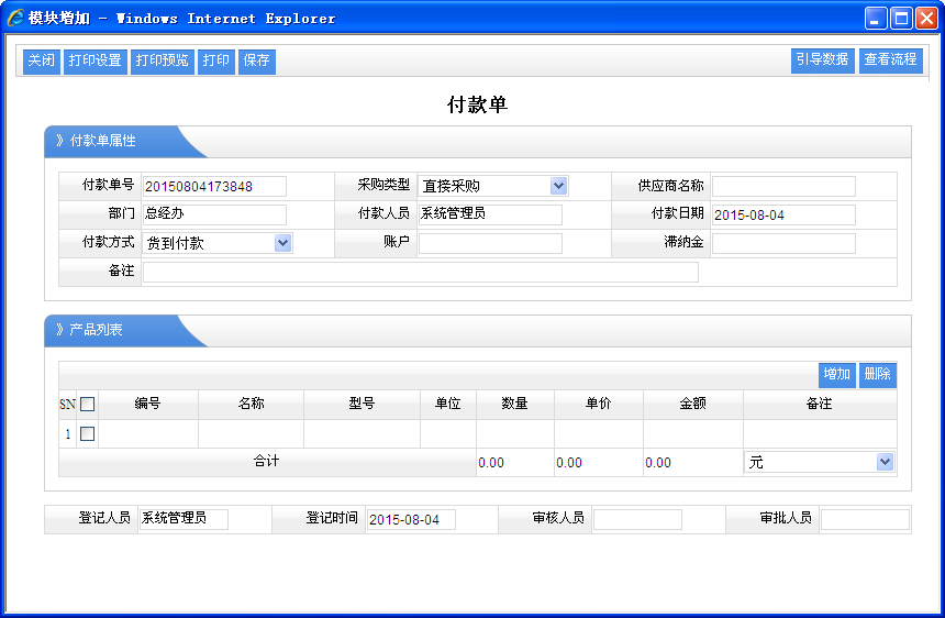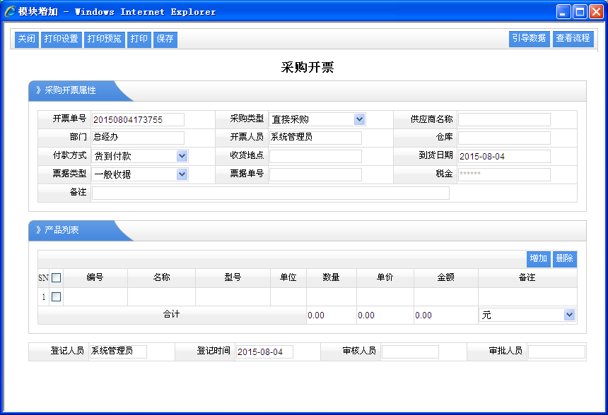 操作功能:頁面設(shè)置,打印設(shè)置,打印預(yù)覽,打印,增加,刪除,明細(xì),導(dǎo)出EXCEL,導(dǎo)出WORD,審核,反審核,審批,反審批等功能。