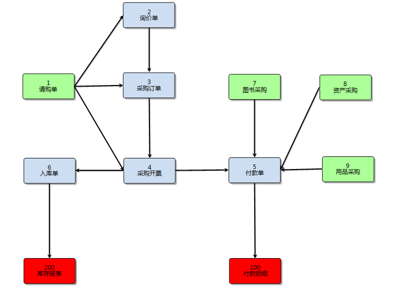 采購管理就是向供應(yīng)商進(jìn)行采購過程中的數(shù)據(jù)計(jì)算方面的管理,而單據(jù)的列表都是以按機(jī)構(gòu)部門等級(jí)權(quán)限進(jìn)行查看,也就是說,上級(jí)部門能夠看到下級(jí)部門的錄入的單據(jù)。其采購流程如下: