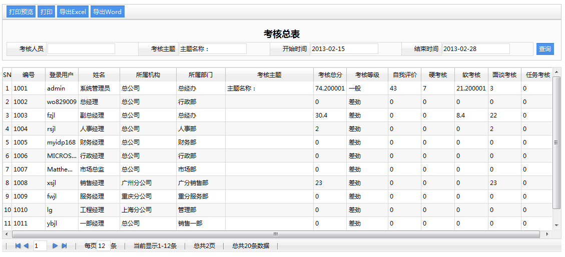 操作功能:頁面設(shè)置,打印設(shè)置,打印預(yù)覽,打印,明細(xì),導(dǎo)出EXCEL,導(dǎo)出WORD,硬考核等功能。