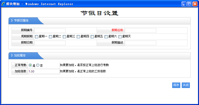通常是對一年內(nèi)有那此節(jié)日進行設(shè)置,在這里主要是對節(jié)假日期間不進行考勤,以及如果在這期進行加班的處理。