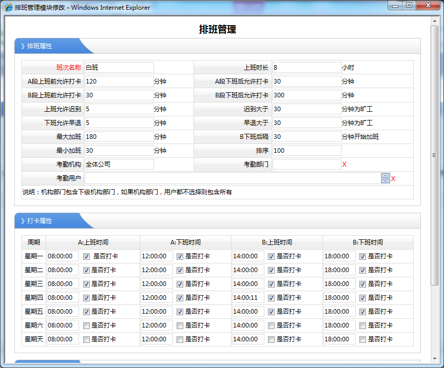 9、上下班時間:通常一個班次分兩次上班,A段、B段,就是上午、下午類似。如果選中是否打卡則就是進行考勤,沒有選中則不進行考勤。