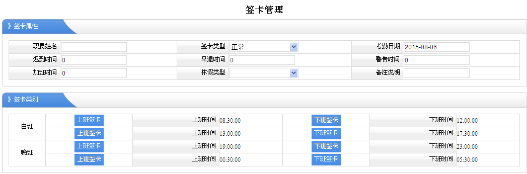 考勤管理是對有些某些情況未能正??记?,進行簽卡,以及對打卡的情況進行查看,統(tǒng)計。