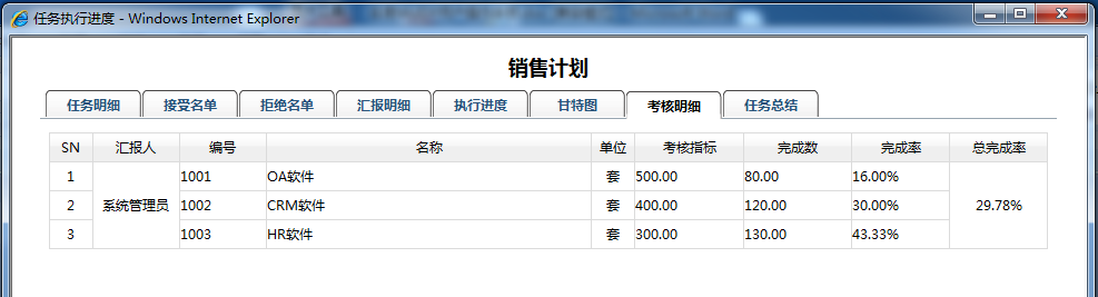 5、 考核明細(xì):是對(duì)分配的任務(wù)進(jìn)行一個(gè)實(shí)時(shí)的考核情況,該完成多少,已經(jīng)完成了多少,以及其完成百分比