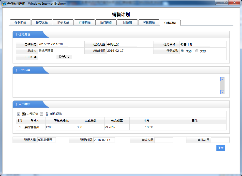 進(jìn)度是該任務(wù)執(zhí)行的進(jìn)度情況,任務(wù)接受情況,任務(wù)匯報(bào)明細(xì),時(shí)間進(jìn)度及完成數(shù)據(jù),實(shí)時(shí)考核明細(xì),對(duì)此任務(wù)進(jìn)行總結(jié)等操作,其操作界面跟計(jì)劃的進(jìn)度操作類(lèi)似,這里不作詳細(xì)介紹,詳細(xì)參考計(jì)劃管理