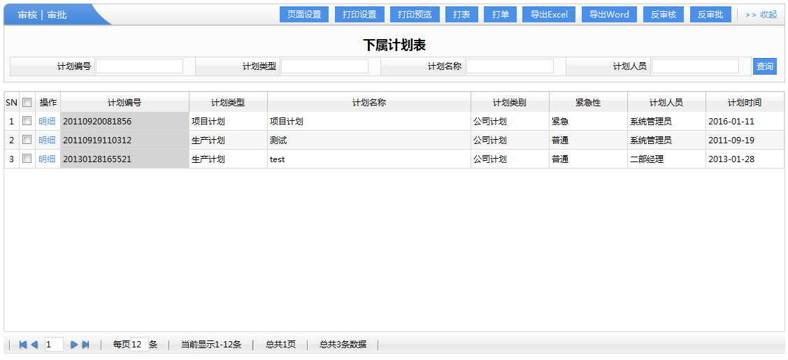 下屬計(jì)劃是我的下屬制定的計(jì)劃的所有列表,可以對(duì)下屬計(jì)劃進(jìn)行審核,審批,查看其明細(xì)等操作