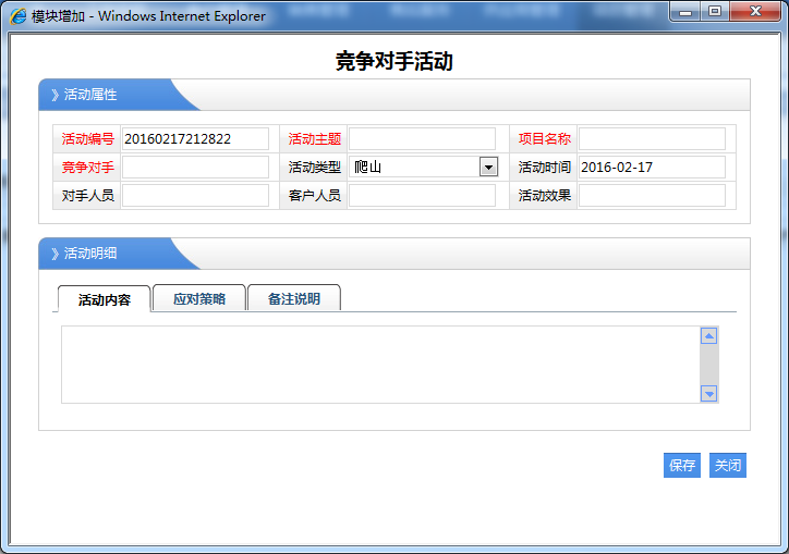 這里主要介紹關(guān)于此項(xiàng)目競(jìng)爭(zhēng)對(duì)手采取的銷售跟蹤情況,如銷售活動(dòng)等信息的管理,以幫助分析更能戰(zhàn)勝對(duì)手。