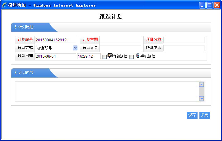 是銷售人員對(duì)此項(xiàng)目進(jìn)行一個(gè)跟蹤聯(lián)系的計(jì)劃綱要,到了聯(lián)系時(shí)間,系統(tǒng)就可以通過(guò)系統(tǒng)短信,手機(jī)短信來(lái)提醒該銷售人員。幫助銷售人員更好,更有效的維護(hù)此客戶。這個(gè)計(jì)劃跟“聯(lián)系計(jì)劃”類似。