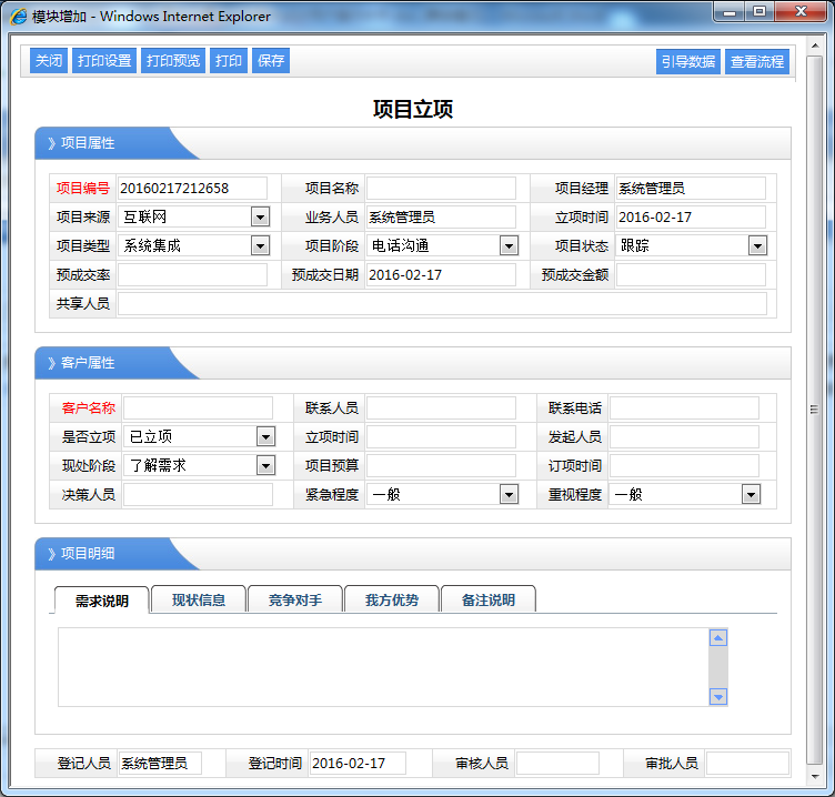 項(xiàng)目銷售主要是針對(duì)一些銷售比較復(fù)雜的產(chǎn)品、項(xiàng)目,實(shí)施過(guò)程時(shí)期比較長(zhǎng)的銷售項(xiàng)目,在這里主要是介紹項(xiàng)目銷售前過(guò)程的管理,如項(xiàng)目跟蹤,項(xiàng)目活動(dòng),項(xiàng)目預(yù)算,售前調(diào)研,以及項(xiàng)目團(tuán)隊(duì)管理等。項(xiàng)目管理也有一個(gè)項(xiàng)目中心,項(xiàng)目立項(xiàng)后,就可以進(jìn)入項(xiàng)目中心對(duì)此項(xiàng)目的管理所有管理都可以進(jìn)入項(xiàng)目中心進(jìn)行添加、維護(hù)等操作。