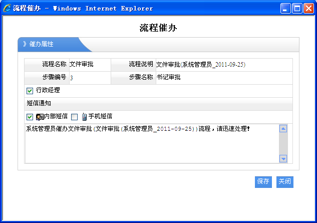 這里操作很簡單,如果流程設(shè)計有多個人進處理,則彈出可以進行多個人選擇,當(dāng)然你可以去掉一些人員,如果需要系統(tǒng)短信,手機短信提醒功能,則鉤選其控件,提醒內(nèi)容也可以根據(jù)自己的意思進行填寫。