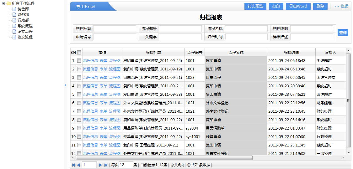 1、左邊是流程的類型,右邊是流程歸檔后的列表。