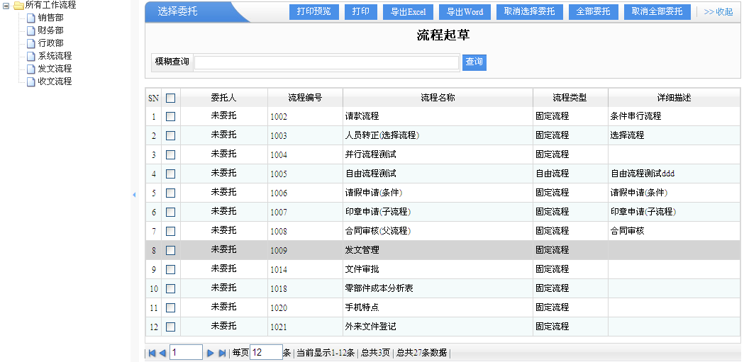1、左邊是流程的類型,右邊則是左邊流程類型的自己有權(quán)限處理的所有流程列表。