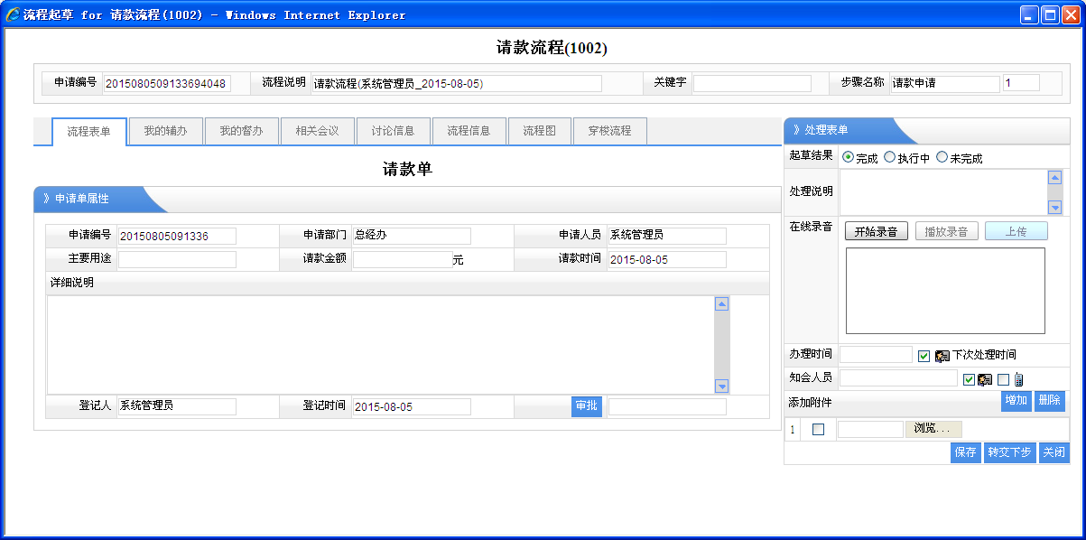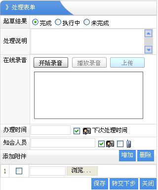 4、流程處理:就是流程處理的表單之外的共同處理表單??梢赃M行補充說明的地方。以及該步驟處理的結(jié)果,也可以添加多個附件,如果上傳的文件是OFFICE類型的文檔(DOC,XLS,PPT等),則具有OFFICE插件方面的管理功能,如:在線保存,添加印章,手寫簽名,手工繪圖,文件套紅,頁面布局,留痕,添加圖片等功能。