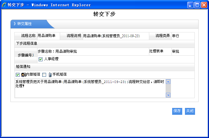 8、保存并轉(zhuǎn)交下步:其實在這里做了兩步操作,一是保存了表單的處理數(shù)據(jù),二是并把此流程轉(zhuǎn)交給下一位處理該流程的人員。