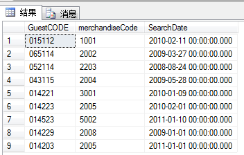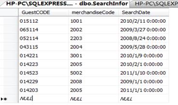 表7.查詢信息表 字段名稱 | 類 型 | 長 度 | 是否主鍵 | 說 明 | GuestCODE | varchar | 10 | 是 | 顧客代碼 | merchandiseCode | varchar | 16 | 否 | 商品代碼 |