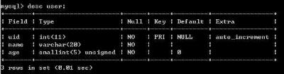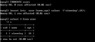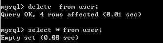 掌握delete的語法和注意事項(xiàng)。 1、delete的基本語法 單表語法: DELETE FROM table_name [WHERE where_definition] [ORDER BY ...] [LIMIT row_count] 多表語法: DELETE table_name[.*] [, table_name[.*] ...] FROM table_references [WHERE where_definition] 或: DELETE [LOW_PRIORITY] [QUICK] [IGNORE] FROM tbl_name[.*] [, tbl_name[.*] ...] USING table_references [WHERE where_definition] 2、delete的常用實(shí)例 首先是一個(gè)數(shù)據(jù)表如下  2.1 刪除指定行 delete from user where uid = 6 ;  tbl_name中有些行滿足由where_definition給定的條件。MySQL DELETE用于刪除這些行,并返回被刪除的記錄的數(shù)目。 2.2 刪除所有行 delete from user;  如果您編寫的DELETE語句中沒有WHERE子句,則所有的行都被刪除。 2.2.1 如果您刪除的行中包括用于AUTO_INCREMENT列的最大值,則該值被重新用于BDB表,但是不會(huì)被用于MyISAM表或InnoDB表。如果您在AUTOCOMMIT模式下使用DELETE FROM tbl_name(不含WHERE子句)刪除表中的所有行,則對(duì)于所有的表類型(除InnoDB和MyISAM外),序列重新編排。對(duì)于InnoDB表,此項(xiàng)操作有一些例外。  2.3 清空數(shù)據(jù)表 當(dāng)您不想知道被刪除的行的數(shù)目時(shí),有一個(gè)更快的方法,即使用TRUNCATE TABLE。 TRUNCATE TABLE 清空數(shù)據(jù)表會(huì)將索引表一并清空,再次添加記錄從默認(rèn)值開始。