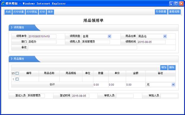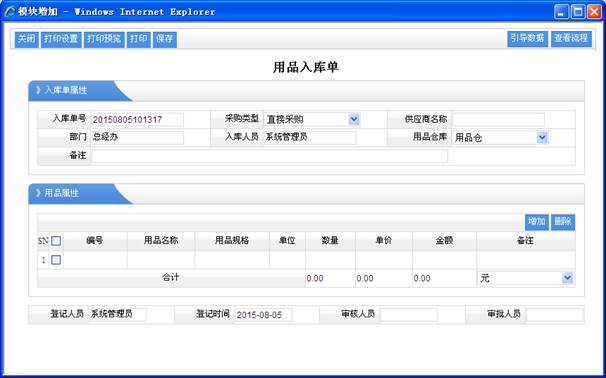 用品管理從財(cái)務(wù)角度來說,就是低值易耗品管理,再通俗一點(diǎn)說,用品使用了以后,那么用品就不存在了,比如說簽字筆,員工領(lǐng)用了簽字筆,那么我們的用品倉庫就不會(huì)再有了,所以說他管理沒有向資產(chǎn)管理那么復(fù)雜,而且用品一般的話都是不是很值錢的,但有他的獨(dú)特管理之處,其系統(tǒng)流導(dǎo)航圖 1、基礎(chǔ)設(shè)置 基礎(chǔ)設(shè)置就是對(duì)用品所關(guān)聯(lián)的類型的管理。這里操作很簡(jiǎn)單,大致介紹一下。 1.1、用品分類 就是把用品分成多個(gè)類型,以方便進(jìn)行查詢及統(tǒng)計(jì)分析。 注意:用品分類,大分類會(huì)包含小的分類,所以一定要選擇對(duì)上級(jí)分類。 1.2、用品登記 就是用品的最基本的屬性的管理。 操作功能:頁面設(shè)置,打印設(shè)置,打印預(yù)覽,打印,增加,修改,刪除,明細(xì),導(dǎo)出EXCEL,導(dǎo)出WORD等功能。 1.3、用品倉庫 就是用來存儲(chǔ)用品的地方,以方便進(jìn)行集中進(jìn)行管理。 操作功能:頁面設(shè)置,打印設(shè)置,打印預(yù)覽,打印,增加,修改,刪除,明細(xì),導(dǎo)出EXCEL,導(dǎo)出WORD等功能。 1.4、用品管理 用品就是公司的日用品,如記事本,簽字筆,勞保用品等。而用品管理主要是對(duì)公司日常用品的采購,入庫,領(lǐng)用等管理。這里也引用了用品管理流程,其流程圖如下: 1.5、用品采購 就是對(duì)用品的進(jìn)行購買登記的記錄,其增加的記錄可以在“用品采購表”中查詢 選擇用品來源于用品登記 操作功能:頁面設(shè)置,打印設(shè)置,打印預(yù)覽,打印,增加,刪除,明細(xì),導(dǎo)出EXCEL,導(dǎo)出WORD,審核,反審核,審批,反審批等功能。 1.6、用品入庫 對(duì)用品采購后進(jìn)行用品存儲(chǔ)到對(duì)應(yīng)的用品倉庫里,其增加的結(jié)果可以在“用品入庫表”中查詢到。  功能特點(diǎn):庫存數(shù)量增加。 操作功能:頁面設(shè)置,打印設(shè)置,打印預(yù)覽,打印,增加,刪除,明細(xì),導(dǎo)出EXCEL,導(dǎo)出WORD,審核,反審核,審批,反審批等功能。 1.7、用品領(lǐng)用 員工要需要用品就可以到用品管理員那里去領(lǐng)用對(duì)應(yīng)的用品,其領(lǐng)用的記錄可以在“用品領(lǐng)用表”中查詢到。 功能特點(diǎn):庫存數(shù)量減少。 操作功能:頁面設(shè)置,打印設(shè)置,打印預(yù)覽,打印,增加,刪除,明細(xì),導(dǎo)出EXCEL,導(dǎo)出WORD,審核,反審核,審批,反審批等功能。 1.8、用品庫存表 就是對(duì)現(xiàn)有用品的進(jìn)行統(tǒng)計(jì)管理 操作功能:頁面設(shè)置,打印設(shè)置,打印預(yù)覽,打印,導(dǎo)出EXCEL,導(dǎo)出WORD等功能。