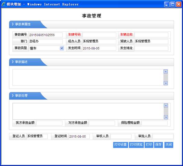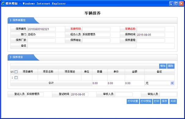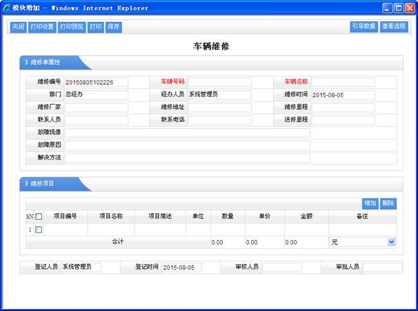 車輛管理軟件主要是對公司行政車輛的管理,主要是針對于公司小轎車,而不是物流公司的運輸車輛的管理,如果要查看物流運輸公司的車輛管理,請查看名易MyTMS物流管理系統(tǒng);主要管理用車申請,派車管理,用完車再還車管理,車輛維修,車輛保養(yǎng),車輛保險,車輛事故等功能模塊的管理,其系統(tǒng)導(dǎo)航圖  1基礎(chǔ)設(shè)置 基礎(chǔ)設(shè)置就是對車輛所關(guān)聯(lián)的類型的管理。這里操作很簡單,大致介紹一下。 1.1、車輛登記 就是對現(xiàn)有的車輛,或購買的車輛進行最基礎(chǔ)的數(shù)據(jù)記錄。其增加的結(jié)果可以要“所有車輛”中查詢到 操作功能:頁面設(shè)置,打印設(shè)置,打印預(yù)覽,打印,增加,刪除,明細,導(dǎo)出EXCEL,導(dǎo)出WORD,審核,反審核,審批,反審批等功能。 1.2、車輛類型 就是對車輛是進行分類處理,如果車輛比較多就可以很好區(qū)分車輛。 操作功能:頁面設(shè)置,打印設(shè)置,打印預(yù)覽,打印,增加,修改,刪除,明細,導(dǎo)出EXCEL,導(dǎo)出WORD等功能。 1.3、費用類型 就是對車輛所產(chǎn)生的有那幾種類型的費用,如“路橋費,洗車費,加油費”等。以方便更好的做好統(tǒng)計分析。 操作功能:頁面設(shè)置,打印設(shè)置,打印預(yù)覽,打印,增加,修改,刪除,明細,導(dǎo)出EXCEL,導(dǎo)出WORD等功能。 1.4、事故類型 車輛可能會發(fā)生事故的類型,如“撞車,撞物,撞人”等。 操作功能:頁面設(shè)置,打印設(shè)置,打印預(yù)覽,打印,增加,修改,刪除,明細,導(dǎo)出EXCEL,導(dǎo)出WORD等功能。 1.5、保險類型 車輛所要參加保險的類型 操作功能:頁面設(shè)置,打印設(shè)置,打印預(yù)覽,打印,增加,修改,刪除,明細,導(dǎo)出EXCEL,導(dǎo)出WORD等功能。 2、車輛管理 車輛管理主要是對公司車輛日常行動進行的管理,如車輛行程,油耗,維修,保險等管理。 用車管理流程: 2.1、用車申請 需要用車的人員進行申請用車,其申請的結(jié)果在“用車申請表”中查詢。  操作功能:頁面設(shè)置,打印設(shè)置,打印預(yù)覽,打印,增加,刪除,明細,導(dǎo)出EXCEL,導(dǎo)出WORD,審核,反審核,審批,反審批等功能。 2.2、派車管理 車輛管理人員對申請用車的情況進行合理的安排用車。其派車情況可以在“派車管理表”中查詢。 操作功能:頁面設(shè)置,打印設(shè)置,打印預(yù)覽,打印,增加,刪除,明細,導(dǎo)出EXCEL,導(dǎo)出WORD,審核,反審核,審批,反審批等功能。 2.3、用車歸還 用車人員用完車后進行把車歸還到車輛管理處,以更合理的安排車輛。歸還情況在“用車歸還表”中查詢。 操作功能:頁面設(shè)置,打印設(shè)置,打印預(yù)覽,打印,增加,刪除,明細,導(dǎo)出EXCEL,導(dǎo)出WORD,審核,反審核,審批,反審批等功能。 2.4、油耗管理 就是對車輛加油的管理,以及每次加油的所行駛的里程等方面的管理。其增加的結(jié)果可以在“油耗管理表”中查詢。  注意:要準確填寫“加油里程,剩余油量,上次加油里程,上次加油后油量”這里會自動計算出共計里程,總共耗油”等。 1、加油里程:是本次加油時的車輛里程表數(shù)值。 2、剩余油量:本次加油時還剩多少油量。 3、上次加油里程:是上一次加油時的車輛里程表數(shù)值。 4、上次加油后油量:是上一次加油后總共油量。 操作功能:頁面設(shè)置,打印設(shè)置,打印預(yù)覽,打印,增加,刪除,明細,導(dǎo)出EXCEL,導(dǎo)出WORD,審核,反審核,審批,反審批等功能。 2.5、車輛送修 有的時候車輛損壞程度比較嚴重,當(dāng)天沒有辦法,只能送去進行維修。其送修記錄可以在“車輛送修表”中查詢。 操作功能:頁面設(shè)置,打印設(shè)置,打印預(yù)覽,打印,增加,刪除,明細,導(dǎo)出EXCEL,導(dǎo)出WORD,審核,反審核,審批,反審批等功能。 2.6、車輛維修 就是正式對車輛進行維修情況的記錄,其維修記錄可以在“車輛維修表”中查詢。 操作功能:頁面設(shè)置,打印設(shè)置,打印預(yù)覽,打印,增加,刪除,明細,導(dǎo)出EXCEL,導(dǎo)出WORD,審核,反審核,審批,反審批等功能。 2.7、車輛保養(yǎng) 就是車輛進行保養(yǎng)登記的管理。以方便了解其車輛的保養(yǎng)情況。其保養(yǎng)的結(jié)果可以在“車輛保養(yǎng)表”中查詢。 操作功能:頁面設(shè)置,打印設(shè)置,打印預(yù)覽,打印,增加,刪除,明細,導(dǎo)出EXCEL,導(dǎo)出WORD,審核,反審核,審批,反審批等功能。 2.8、費用管理 是該車輛所產(chǎn)生一切費用的登記,其登記費用的結(jié)果在“費用管理表”中查詢。 操作功能:頁面設(shè)置,打印設(shè)置,打印預(yù)覽,打印,增加,刪除,明細,導(dǎo)出EXCEL,導(dǎo)出WORD,審核,反審核,審批,反審批等功能。 2.9、保險管理 就是對該車輛參考所有的保險記錄,其增加的結(jié)果可以在“保險管理表”中查詢。  操作功能:頁面設(shè)置,打印設(shè)置,打印預(yù)覽,打印,增加,刪除,明細,導(dǎo)出EXCEL,導(dǎo)出WORD,審核,反審核,審批,反審批等功能。 2.10、事故管理 就是該車輛所發(fā)生的事故進行登記管理,其增加的結(jié)果可以在“事故管理表”中查詢到。 操作功能:頁面設(shè)置,打印設(shè)置,打印預(yù)覽,打印,增加,刪除,明細,導(dǎo)出EXCEL,導(dǎo)出WORD,審核,反審核,審批,反審批等功能。
