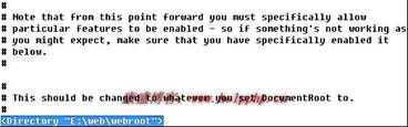 4.更改php.ini,Ctrl+F查找extension_dir,把它改成:extension_dir = “E:webphpext”。這個(gè)就是擴(kuò)展目錄,一些PHP擴(kuò)展組件就是在這個(gè)目錄下。 四、apache和php整合(模塊的方式) 1.打開E:webapacheconf目錄下的httpd.conf(這是apache的配置文件) 2.在web目錄新建一個(gè)文件夾:webroot(用于放置網(wǎng)站文件) 3.Ctrl+F查找“DocumentRoot”并它改成:DocumentRoot “E:webwebroot” 4.在DocumentRoot下面不遠(yuǎn)處有個(gè)Directory,改成”E:webwebroot”,如圖: