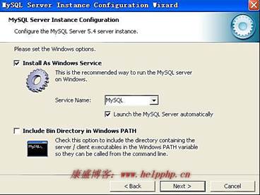 上圖就是為mysql選擇一個(gè)服務(wù)名并注冊到系統(tǒng)中,Launch the mysql server automatically選項(xiàng)是否自動(dòng)運(yùn)行mysql服務(wù)。