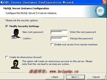 為你的MySQL設(shè)定密碼,選項(xiàng)告訴我們是否充許運(yùn)程連接。