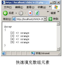 4.14 快速填充數(shù)組元素 PHP提供函數(shù)快速填充數(shù)組,將數(shù)組中的某些或所有元素都置成通一個(gè)值,這個(gè)函數(shù)是array_fill(),其語(yǔ)法如下所示。 array array_fill(int $start, int $num, mixed $value) 函數(shù)array_fill()有3個(gè)參數(shù):其中參數(shù)$start指定要填充元素的開(kāi)始索引,參數(shù)$num表示將$num個(gè)數(shù)組元素以參數(shù)$value填充。