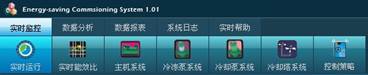 圖3-2 系統(tǒng)主要功能分成5個大類,包括實時監(jiān)控、數(shù)據(jù)分析、數(shù)據(jù)報表、系統(tǒng)日志和實時幫助,其中實時監(jiān)控包括實時運行、實時能效比、主機系統(tǒng)、冷凍泵系統(tǒng)、冷卻泵系統(tǒng)、冷卻塔系統(tǒng)、控制策略共7個子菜單;數(shù)據(jù)分析包括系統(tǒng)COP分析、主機COP分析、冷凍泵分析、冷卻泵分析、冷卻塔分析、冷凍水分析、冷卻水分析和綜合分析共8個子菜單;數(shù)據(jù)報表包括系統(tǒng)組件報表、水溫報表和節(jié)費與減排報表共3個子菜單;系統(tǒng)日志部分包括報警日志和操作日志;實時幫助可顯示公司和產(chǎn)品相關(guān)信息。下面對系統(tǒng)中主要子系統(tǒng)功能進行介紹。 系統(tǒng)實時運行界面