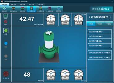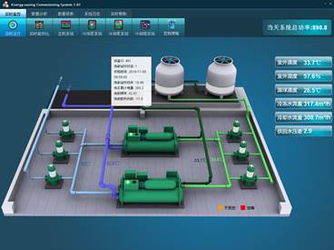 圖2-3 實時運行界面 實時運行界面如圖2-3所示,界面可顯示系統(tǒng)中各個機電設(shè)備的運行狀態(tài)及相關(guān)參數(shù)顯示。 設(shè)備(空調(diào)主機、冷卻冷凍水泵、冷卻塔)正常運行時,界面上會仿真模擬設(shè)備運行,例如冷卻塔風(fēng)機旋轉(zhuǎn)等。設(shè)備停止運行,則相應(yīng)設(shè)備顯示停止?fàn)顟B(tài)。當(dāng)設(shè)備存在故障或者是不受控狀態(tài)(旁路或者就地)時,該設(shè)備會通過不同的顏色顯示相應(yīng)的狀態(tài)。 界面可實時顯示系統(tǒng)中的重要運行參數(shù)。在系統(tǒng)的管路附近,標(biāo)注了當(dāng)前管道的水溫,有冷凍水出水、回水溫度和冷卻水出水、回水溫度,在界面的右邊,顯示了當(dāng)前室外溫度、濕度、濕球溫度、冷凍水流量、冷卻水流量和供回水壓差。 當(dāng)鼠標(biāo)移動到設(shè)備上面時,可以顯示該設(shè)備的相關(guān)信息,包括開關(guān)機時間、當(dāng)前運行頻率等。雙擊設(shè)備,可以跳轉(zhuǎn)到設(shè)備的運行界面。 實時能效比監(jiān)控界面