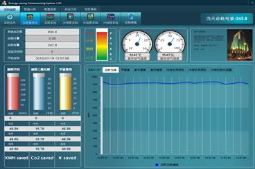 圖2-4實時能效比監(jiān)控 實時能效比監(jiān)控界面如圖2-4所示,界面分成三個部分,上端從左到右分別顯示系統(tǒng)實時統(tǒng)計信息(總功率、總制冷量、總耗電量、總運行時間)、系統(tǒng)實時COP值、室外溫度、室外濕度和建筑環(huán)境的相關(guān)介紹。 界面左下方區(qū)域可實時計算并顯示系統(tǒng)當(dāng)日、當(dāng)月、當(dāng)年的節(jié)省電量,根據(jù)電量計算的CO2減排量和節(jié)省費用數(shù)量。 界面右下方區(qū)域顯示系統(tǒng)中重要數(shù)據(jù)的實時曲線,包括實時COP曲線、實時功率曲線、節(jié)能量曲線、室外溫度曲線、室外濕度曲線、冷凍水供回水曲線、冷卻水供回水曲線、冷凍冷卻水流量曲線。點擊上面的標(biāo)簽欄進行切換曲線類型。 主機系統(tǒng)監(jiān)控