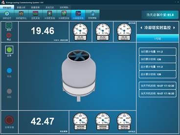 冷卻泵系統(tǒng)監(jiān)控界面中可實時查看系統(tǒng)中冷凍水泵的運行狀態(tài)參數(shù),包括水泵運行狀態(tài)(運行停止)、工作模式(正常就地旁路)、故障狀態(tài)、設(shè)備實時功率、設(shè)備實時運行頻率、三相電流、三相電壓; 在界面的右面可以對系統(tǒng)中的設(shè)備進行選擇,可顯示冷卻泵的一些統(tǒng)計參數(shù),包括當(dāng)天累計時間、總共累計時間、當(dāng)天累計電量、總共累計電量、當(dāng)天開機時間和當(dāng)天關(guān)機時間等。 系統(tǒng)操作員可以通過左上角的設(shè)備啟停按鈕來啟停設(shè)備,當(dāng)點擊運行/停止按鈕時,系統(tǒng)會彈出相應(yīng)的提示框確認操作,當(dāng)操作確認成功后,系統(tǒng)會對設(shè)備發(fā)送相應(yīng)的啟停命令,實現(xiàn)對設(shè)備的啟停操作。 冷卻塔設(shè)備監(jiān)控界面