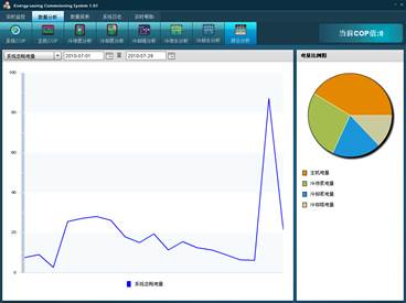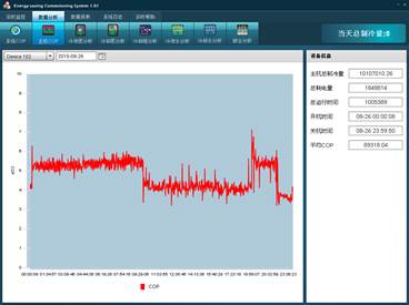系統(tǒng)提供兩種控制模式進行選擇,自動控制模式和緊急控制模式。自動控制模式下,系統(tǒng)根據(jù)全面的參數(shù)的采集分析,計算得到設(shè)備最優(yōu)的控制頻率,在保證制冷量的前提下,使得系統(tǒng)耗能最低。緊急控制模式是提供給用戶一個手動模式,用戶可以在輸入框內(nèi)填入固定頻率值,控制設(shè)備以這個固定頻率運行。 主機COP分析界面