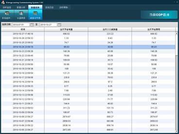 系統(tǒng)可通過選擇起始時間,將這一段時間的數(shù)據(jù)繪制成曲線,方便用戶做數(shù)據(jù)分析。數(shù)據(jù)分析對象包括系統(tǒng)總耗電量、系統(tǒng)總功率、系統(tǒng)總制冷量、系統(tǒng)平均COP值、系統(tǒng)節(jié)電量、系統(tǒng)減排CO2數(shù)量和系統(tǒng)節(jié)約費用數(shù)量。 系統(tǒng)組件能耗報表