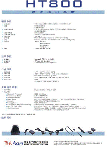 掃描終端設備HT800是一款運算功能強大、機體堅固耐用、無線即時傳輸穩(wěn)定的工業(yè)級移動終端。無論在零售商店、倉庫、裝貨站、郵政旅途、或需兼顧效能和耐用的場所,HT800都可提供優(yōu)異的條碼掃描和無線行動運算功能。 HT800是一款運算功能超強的移動式終端設備,此款設備裝載微軟專業(yè)級(Professional Ver.)作業(yè)系統(tǒng)及高速運算功能之處理器,并內置高性能一維條碼讀取引擎。記憶體為256ROM/128RAM便于軟體發(fā)展及資料管理,此款設備亦配置具加密功能之標準micro SD記憶體擴充插槽,便于記憶體擴充及資料保密。 HT800具有2.8英寸之高亮度全彩觸控屏及讀取震動功能,無論是室外還是環(huán)境嘈雜,使用者依然可以輕松閱讀視屏訊息及確認讀取資料。內置藍牙及WIFI(802.11b/g)并支援思科(Cisco)網絡規(guī)范,提升資料在無線網絡交換的安全性和穩(wěn)定性。其藍牙和WIFI共用功能讓使用者可以一邊微型打印機一邊可即時資料交換。 HT800具有支援終端仿真類比環(huán)境之功能及USB和RS232通訊串口。提供整合式SDK軟體發(fā)展工具,支援多種I/O驅動及多種資料登錄模式。 HT800不僅可承受1.2米摔落高度外,亦經過200次1米的隨機多角度撞擊(Random Drop Test)測試通過。 HT800除上述特性外,其符合人機工學的把手設計,方便好握。IP54工業(yè)級防塵防水規(guī)范,能在惡劣的環(huán)境下操作使用。