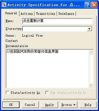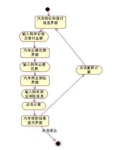 摘要 :本文檔系統(tǒng)闡述一個(gè)實(shí)現(xiàn)汽車(chē)貨款計(jì)算功能的一個(gè)小軟件,本文檔主要介紹該軟件的開(kāi)發(fā)背景及其市場(chǎng)需求,在開(kāi)發(fā)過(guò)程中的具體功能需求,以及設(shè)計(jì)約束條件,作為將來(lái)項(xiàng)目設(shè)計(jì)、測(cè)試和驗(yàn)收的標(biāo)準(zhǔn)。 簡(jiǎn)介 通過(guò)采用許多不同的構(gòu)架視圖描述我們的汽車(chē)貸款計(jì)算器系統(tǒng)的各個(gè)方面,包括汽車(chē)購(gòu)價(jià)和首付信息、汽車(chē)必要花費(fèi)、汽車(chē)商業(yè)保險(xiǎn)、汽車(chē)貸款結(jié)果顯示和系統(tǒng)內(nèi)部的計(jì)算問(wèn)題,本軟件構(gòu)架文檔從面向?qū)ο?、?gòu)架的角度對(duì)整個(gè)系統(tǒng)進(jìn)行綜合概述。 1.1 目的 本軟件構(gòu)架文檔提供我們的軟件系統(tǒng)汽車(chē)貸款計(jì)算器的構(gòu)架的綜合概述。它用作我們小組構(gòu)架設(shè)計(jì)者和項(xiàng)目團(tuán)隊(duì)的其他成員之間的交流媒介,討論已針對(duì)項(xiàng)目構(gòu)架做出的重要決定。 本文檔將從構(gòu)架方面對(duì)我們的系統(tǒng)進(jìn)行發(fā)綜合概述,其中使用多種通過(guò)Raional rose 設(shè)計(jì)的不同的構(gòu)架視圖來(lái)描述系統(tǒng)的各個(gè)方面。它用于記錄并表述已對(duì)系統(tǒng)的構(gòu)架方面作出的重要決策。并在交流中不修改本文檔。 1.2 范圍 本文檔主要面向小組內(nèi)部成員,包括小組的架構(gòu)設(shè)計(jì)者、小組的決策者、小組的項(xiàng)目實(shí)現(xiàn)相關(guān)人員、審核部門(mén)和上級(jí)管理部門(mén)。 1.3 定義、首字母縮寫(xiě)詞和縮略語(yǔ) 對(duì)于類(lèi)的定義部分,采用了英語(yǔ)的完整合拼,如insure_glassbreakup 代表的是商業(yè)保險(xiǎn)下的玻璃單獨(dú)破碎險(xiǎn),本身的英文與中文并不是完整的對(duì)譯,詳情請(qǐng)參照系統(tǒng)架構(gòu)圖。 1.4 參考資料 《面向結(jié)構(gòu)軟件需求規(guī)約_汽車(chē)貨款計(jì)算軟件》 《面向結(jié)構(gòu)的功能模塊劃分_汽車(chē)貨款計(jì)算軟件》 《面向結(jié)構(gòu)的功能模塊的過(guò)程設(shè)計(jì)_汽車(chē)貨款計(jì)算軟件》 2 系統(tǒng)構(gòu)架  2.1 類(lèi) 1、狀態(tài)機(jī)類(lèi) 屬性:  方法: 打開(kāi)各個(gè)界面 2、系統(tǒng)內(nèi)部計(jì)算類(lèi) 屬性:  方法: 如利用貸款公式計(jì)算貸款花費(fèi) 3、常量lending類(lèi) 屬性:  方法: 給常量貸款率賦值等。這里采用的是protected ,主要是這個(gè)常量一般是定值,不需要修改 4、汽車(chē)購(gòu)價(jià)和首付信息buy類(lèi) 屬性:  方法: 從界面獲取對(duì)應(yīng)值,賦給系統(tǒng) 2、汽車(chē)必要花費(fèi)need類(lèi) 屬性:  方法: 從界面獲取對(duì)應(yīng)值,賦給系統(tǒng) 2、汽車(chē)商業(yè)保險(xiǎn)insure類(lèi) 屬性:  方法: 從界面獲取對(duì)應(yīng)值,賦給系統(tǒng) 2、汽車(chē)貸款結(jié)果顯示result類(lèi) 屬性:  方法: 從界面獲取對(duì)應(yīng)值,賦給系統(tǒng),這里的protected 表示結(jié)果類(lèi)不被用戶(hù)更改,是由系統(tǒng)對(duì)應(yīng)于輸入所生成的 3 用例活動(dòng)圖  過(guò)程: (1) //啟動(dòng)汽車(chē)貸款計(jì)算器軟件 (2) //通過(guò)狀態(tài)機(jī)打開(kāi)汽車(chē)購(gòu)價(jià)和首付信息界面 (3)//輸入汽車(chē)購(gòu)置價(jià)格//選擇首付比例或輸入自定義首付金額//選擇還款年限 (4)//輸入汽車(chē)購(gòu)置稅//輸入汽車(chē)上牌費(fèi)用//輸入車(chē)船使用稅//輸入汽車(chē)交強(qiáng)稅 (5)//輸入第三者責(zé)任險(xiǎn)//輸入車(chē)輛損失險(xiǎn)//輸入全車(chē)盜搶險(xiǎn)//輸入玻璃單獨(dú)破碎險(xiǎn)//輸入自燃損失險(xiǎn)//輸入不計(jì)免賠特約險(xiǎn)//輸入無(wú)過(guò)責(zé)任險(xiǎn) (6)//點(diǎn)擊計(jì)算 (7)//調(diào)用狀態(tài)機(jī),在系統(tǒng)內(nèi)部對(duì)相關(guān)數(shù)據(jù)進(jìn)行運(yùn)算 (8)//顯示需要首付的金額//顯示月供金額//顯示貸款購(gòu)車(chē)的總計(jì)花費(fèi)//顯示貸款購(gòu)車(chē)與全額購(gòu)車(chē)的差額 4 部署視圖  5 實(shí)施視圖  5.1 概述 我們的汽車(chē)貸款計(jì)算軟件的具體實(shí)施如上圖所示,各層面之間的連接條件為當(dāng)輸入完當(dāng) 前頁(yè)面所要求輸入的信息的確定(如:點(diǎn)擊下一步) 5.2 層 層1:輸入購(gòu)車(chē)價(jià)格及首付金額  層2:輸入購(gòu)車(chē)必要花費(fèi)  層3、輸入購(gòu)車(chē)商業(yè)保險(xiǎn)信息  層4、點(diǎn)擊重新計(jì)算  6 數(shù)據(jù)視圖(可選) 基本屬于常量的貸款率:lending_rate。 7 質(zhì)量 本軟件構(gòu)架是通過(guò)Rational rose構(gòu)建的,可以通過(guò)對(duì)rose圖的修改來(lái)對(duì)我們的軟件架構(gòu)進(jìn)行調(diào)整,具有良好的可擴(kuò)展性、可靠性、可移植性。