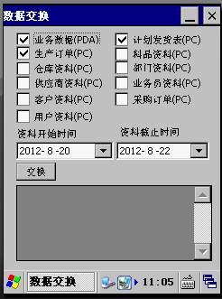 ● 業(yè)務(wù)數(shù)據(jù)(PDA):選擇此項(xiàng)交換時(shí)將PDA設(shè)備上的所有倉庫業(yè)務(wù)數(shù)據(jù)交換至ERP服務(wù)器,交換成功后清空PDA設(shè)備上的業(yè)務(wù)數(shù)據(jù)。 ● 計(jì)劃發(fā)貨表(PC):選擇此項(xiàng)交換時(shí)從ERP服務(wù)器上下載創(chuàng)建時(shí)間從“資料開始時(shí)間”至“資料截止時(shí)間”范圍內(nèi)的計(jì)劃發(fā)貨表資料至PDA設(shè)備。 ● 生產(chǎn)訂單(PC):選擇此項(xiàng)交換時(shí)從ERP服務(wù)器上下載開工時(shí)間從“資料開始時(shí)間”至“資料截止時(shí)間”范圍內(nèi)的生產(chǎn)訂單及其它備料資料至PDA設(shè)備。 ● 料品資料:選擇此項(xiàng)交換時(shí)從ERP服務(wù)器下載料品資料至PDA設(shè)備。 ● 倉庫資料:選擇此項(xiàng)交換時(shí)從ERP服務(wù)器下載倉庫資料至PDA設(shè)備。 ● 部門資料:選擇此項(xiàng)交換時(shí)從ERP服務(wù)器下載部門資料至PDA設(shè)備。 ● 供應(yīng)商資料:選擇此項(xiàng)交換時(shí)從ERP服務(wù)器下載供應(yīng)商資料至PDA設(shè)備。 ● 業(yè)務(wù)員資料:選擇此項(xiàng)交換時(shí)從ERP服務(wù)器下載業(yè)務(wù)員資料(即市場(chǎng)經(jīng)理資料)至PDA設(shè)備。 ● 客戶資料:選擇此項(xiàng)交換時(shí)從ERP服務(wù)器下載市場(chǎng)經(jīng)理的客戶資料至PDA設(shè)備。 ● 采購訂單:選擇此項(xiàng)交換時(shí)從ERP服務(wù)器下載所有未關(guān)閉的采購訂單至PDA設(shè)備。 ● 用戶資料:選擇此項(xiàng)交換時(shí)從ERP服務(wù)器下載ERP系統(tǒng)用戶資料至PDA設(shè)備。 5. 倉儲(chǔ)業(yè)務(wù) ● 銷售發(fā)貨: