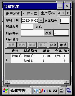 入庫日期:默認(rèn)PDA系統(tǒng)日期。 倉庫編號(hào):生產(chǎn)料品的應(yīng)入倉庫編號(hào)。 參考條碼:生產(chǎn)時(shí)打印粘貼在料品上的一維碼信息(生產(chǎn)訂單號(hào)+行號(hào)),由PDA設(shè)備采集錄入。 數(shù)量:生產(chǎn)入庫的數(shù)量。 班組編號(hào):參考條碼采集或錄入后系統(tǒng)自動(dòng)帶出。 名稱:班組的名稱:系統(tǒng)自動(dòng)帶出 料品名稱:系統(tǒng)自動(dòng)帶出。 ● 生產(chǎn)領(lǐng)料