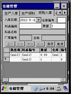 領(lǐng)料日期:默認(rèn)PDA系統(tǒng)日期。 倉庫編號(hào):料品出帳的倉庫。 班組編號(hào):領(lǐng)用料品的班組編號(hào)。 名稱:領(lǐng)用料品班組的名稱。 料品編號(hào):條碼采集或手工錄入,填寫后將自動(dòng)彈出該班組可領(lǐng)用該料品有效生產(chǎn)訂單。 料品名稱:領(lǐng)用料品的名稱,系統(tǒng)自動(dòng)帶出。 數(shù)量:領(lǐng)用料品的數(shù)量。 ● 采購入庫