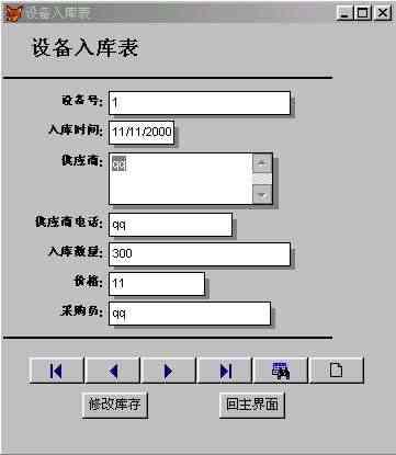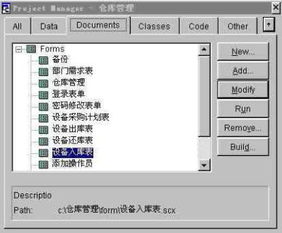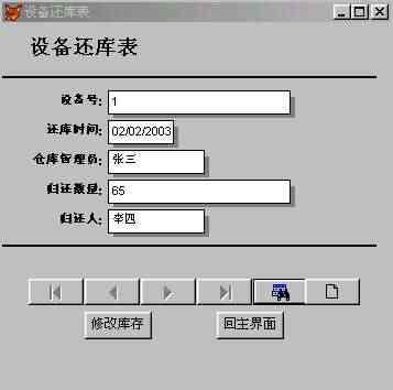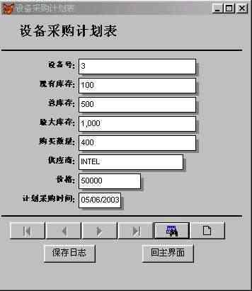 5.2 設(shè)備入庫模塊的設(shè)計(jì) 在設(shè)備入庫模塊中將實(shí)現(xiàn)設(shè)備數(shù)據(jù)的添加和入庫等功能。本模塊設(shè)計(jì)采用先用向?qū)杀韱?,然后修改的方法?shí)現(xiàn)。 首先在項(xiàng)目管理器的文檔視圖下單擊“新建”按鈕,  圖5-3 項(xiàng)目管理器  圖5-4  圖5-5 在接下來的向?qū)е校皵?shù)據(jù)庫和表”選擇“倉儲(chǔ)管理”以及“設(shè)備入庫表”,這是前面定義好的數(shù)據(jù)庫和表。 由于設(shè)備入庫需要顯示所有的字段,因此我們將可用字段全部移至選定字段,如圖所示,單擊“下一步”按鈕,  圖5-6 在表單樣式中,選擇“陰影式”以及“圖片按鈕”,如圖所示。左上角的窗口提供了表單樣式的預(yù)覽功能,圖片按鈕和文本按鈕的區(qū)別在于顯示的時(shí)候是以圖片來表達(dá)功能還是文字來表達(dá),實(shí)現(xiàn)功能的函數(shù)沒有區(qū)別。選擇“上一步”按鈕可以跳回上一個(gè)界面對(duì)表單中顯示的字段進(jìn)行修改。  圖5-7 單擊“下一步”按鈕后,向?qū)нM(jìn)行到“步驟3-排序次序”,如圖所示,選擇“設(shè)備號(hào)”為索引,并選擇升序排列。最后預(yù)覽表單,核對(duì)每項(xiàng)的設(shè)置,完成表單向?qū)?,如圖所示。  圖5-8  圖5-9 值得注意的是,在結(jié)束表單向?qū)埃蛇x擇“保存表單以備將來使用”,“保存并運(yùn)行表單”,或者“保存表單并用表單設(shè)計(jì)器修改表單”。由于Visual FoxPro6.0向?qū)傻谋韱沃痪哂衅毡樾?,?duì)于當(dāng)前設(shè)計(jì)的倉儲(chǔ)管理系統(tǒng)還需要一定的改變,因此以我們選擇“保存表單并用表設(shè)計(jì)器修改表單”。 單擊“完成”按鈕系統(tǒng)提示保存表單,將表單保存為“設(shè)備入庫表.scx”,存于c:倉儲(chǔ)管理目錄下。然后打開表單修改器生成的表單,如圖所示。 在修改BUTTONSET時(shí),可以通過屬性窗口的下拉列表選定單個(gè)按鈕,調(diào)整其位置和其它屬性。如圖所示。  圖 5-10 25  圖 5-11 根據(jù)功能需求,把“cmdprint”、“”cmdexit、“cmdDelete”和“cmdedit”的Visible 屬性都設(shè)為“.F.-假”。添加2個(gè)命令按鈕,Caption屬性分別設(shè)為“修改庫存”和“回主界面”。 ※ 在“回主界面”命令按鈕的click事件中添加代碼如下: thisform.release do form 倉儲(chǔ)管理 ※ 在修改庫存命令按鈕的click事件中添加代碼如下: select 現(xiàn)有庫存表 getid=thisform.設(shè)備號(hào)1.text1.value set order to 設(shè)備號(hào) seek getid if found() getnum=thisform.入庫數(shù)量1.text1.value update 現(xiàn)有庫存表 set 現(xiàn)有庫存=(現(xiàn)有庫存+getnum) where (設(shè)備號(hào)=getid) else insert into 現(xiàn)有庫存表 (設(shè)備號(hào),現(xiàn)有庫存,最大庫存,最小庫存); value (thisform.設(shè)備號(hào)1.text1.value,thisform.入庫數(shù)量1.text1.value,1000,10) endif insert into 操作日志表(操作員,操作內(nèi)容,操作時(shí)間); values (thisform.采購員1.text1.value,'設(shè)備入庫',date()) 保存后運(yùn)行表單,界面如圖所示:  圖 5-12  圖5-13 5.3 設(shè)備出庫模塊的設(shè)計(jì): 在設(shè)備出庫模塊中將實(shí)現(xiàn)設(shè)備出庫數(shù)據(jù)的添加和修改庫存等功能。該模塊的功能和設(shè)備入庫的功能相似。具體操作可以參考設(shè)備入庫模塊的設(shè)計(jì),設(shè)計(jì)最終的界面如圖所示。  5-14 圖 在表單的左上角加上了顯示當(dāng)前時(shí)間的功能,添加標(biāo)簽label2的caption屬性設(shè)為“當(dāng)前時(shí)間”;添加label3的caption屬性設(shè)為空;為當(dāng)前表單的label3init事件添加如下代碼: this.caption=dtoc(date()) 該模塊具體實(shí)現(xiàn)過程不再一一詳細(xì)說明。下面列出了表單中所用到控件的屬性值。 (1) Form1控件的主要屬性: 表5-1 屬性名稱 屬性值 Caption 設(shè)備出庫表 Autocenter .T.-真 BackColor 255.255.255 (2) ButtonSet1控件的主要屬性: 表5-2 控件名 屬性名稱 屬性值 cmdExit Visible .F.-假 cmdDelete Visible .F.-假 cmdPrint Visible .F.-假 cmdEdit Visible .F.-假 Command1 Caption 修改庫存 Command2 Caption 回主界面 下面是設(shè)備出庫表單中“修改庫存”命令按鈕的click事件的代碼: select 現(xiàn)有庫存表 *先在該表單的數(shù)據(jù)環(huán)境中添加現(xiàn)有庫存表 getid=thisform.設(shè)備號(hào)1.text1.value set order to 設(shè)備號(hào) seek getid *在現(xiàn)有庫存表中查找設(shè)備號(hào)等于getid的紀(jì)錄 if found() getnum=thisform.出庫數(shù)量1.text1.value update 現(xiàn)有庫存表; set 現(xiàn)有庫存=(現(xiàn)有庫存-getnum) where (設(shè)備號(hào)=getid) *如果庫存表中有該項(xiàng)設(shè)備,則更新庫存表 insert into 操作日志表(操作員,操作內(nèi)容,操作時(shí)間); values (thisform.領(lǐng)取人1.text1.value,'設(shè)備出庫',date()) else messagebox("出錯(cuò)",1,"錯(cuò)誤的設(shè)備號(hào)") endif 5.4 設(shè)備還庫模塊的設(shè)計(jì) 在設(shè)備還庫模塊中將實(shí)現(xiàn)設(shè)備還庫數(shù)據(jù)的添加和修改庫存等功能,按照前面介紹的步驟設(shè)計(jì)設(shè)備還庫表。 設(shè)備還庫表所可能用到的控件的屬性如表所示: (1)Form1控件的主要屬性: 表5-3 屬性名稱 屬性值 Caption 設(shè)備還庫表 Autocenter .T.-真 BackColor 255.255.255 (2)ButtonSet1控件的主要屬性: 表5-4 控件名 屬性名稱 屬性值 cmdExit Visible .F.-假 cmdDelete Visible .F.-假 cmdPrint Visible .F.
